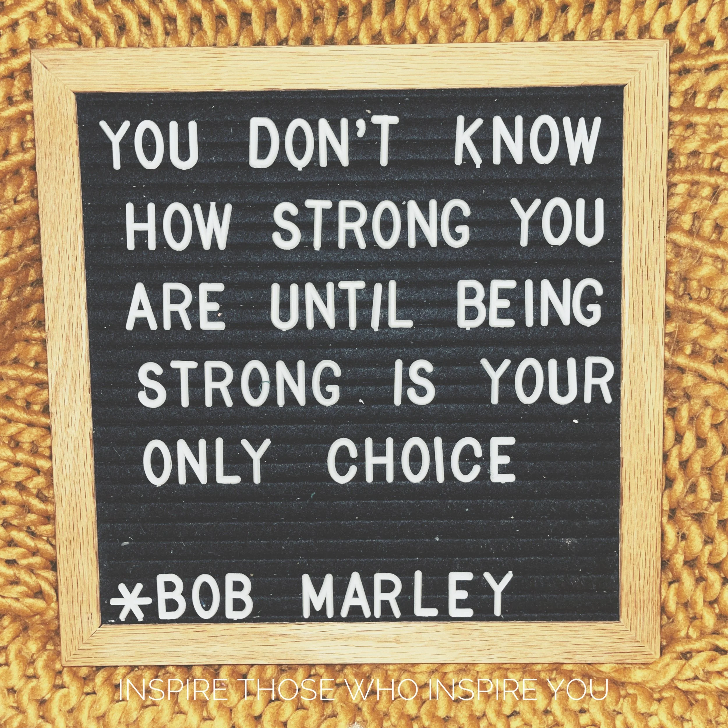 A quote from Bob Marley, “You don’t know how strong you are until being strong is your only choice,” on a letter board in front of a dandelion-knit blanket